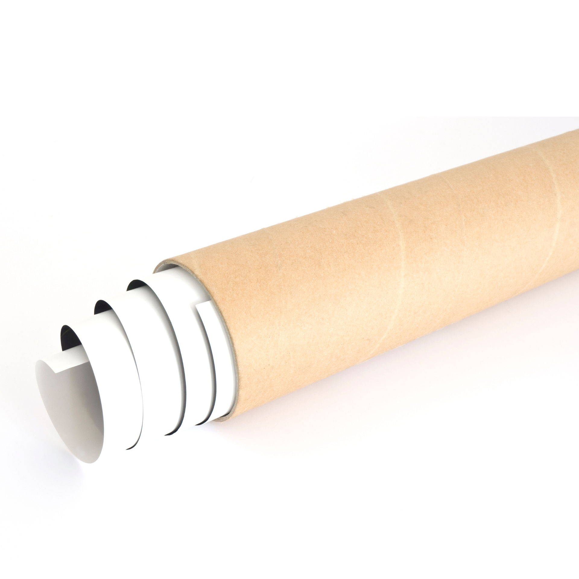 Die Versandhülse ist spiralgewickelt mit Boden und Deckel aus weißem Kunststoff